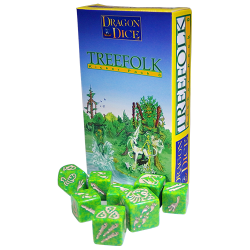 Includes 1 10-sided monster die and 7 6-sided unit dice (4 small 16mm, 2 medium 18mm, and 1 large 20mm) of green and gold Treefolk, plus rules folder.