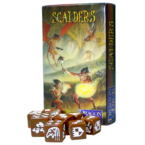 Includes 1 10-sided monster die and 7 6-sided unit dice (4 small 16mm, 2 medium 18mm, and 1 large 20mm) of red and green Scalders, plus the updated rules folder.